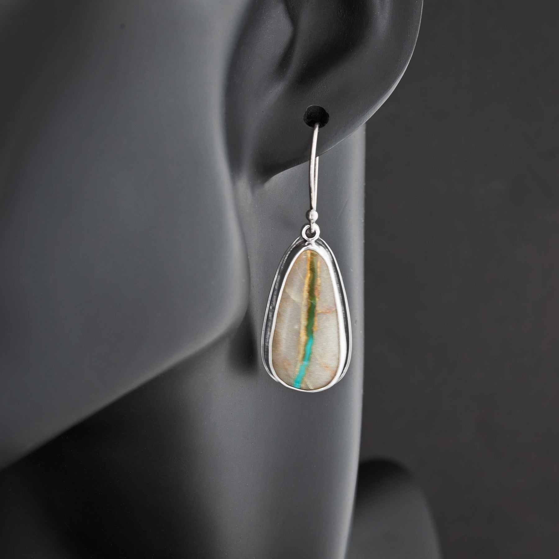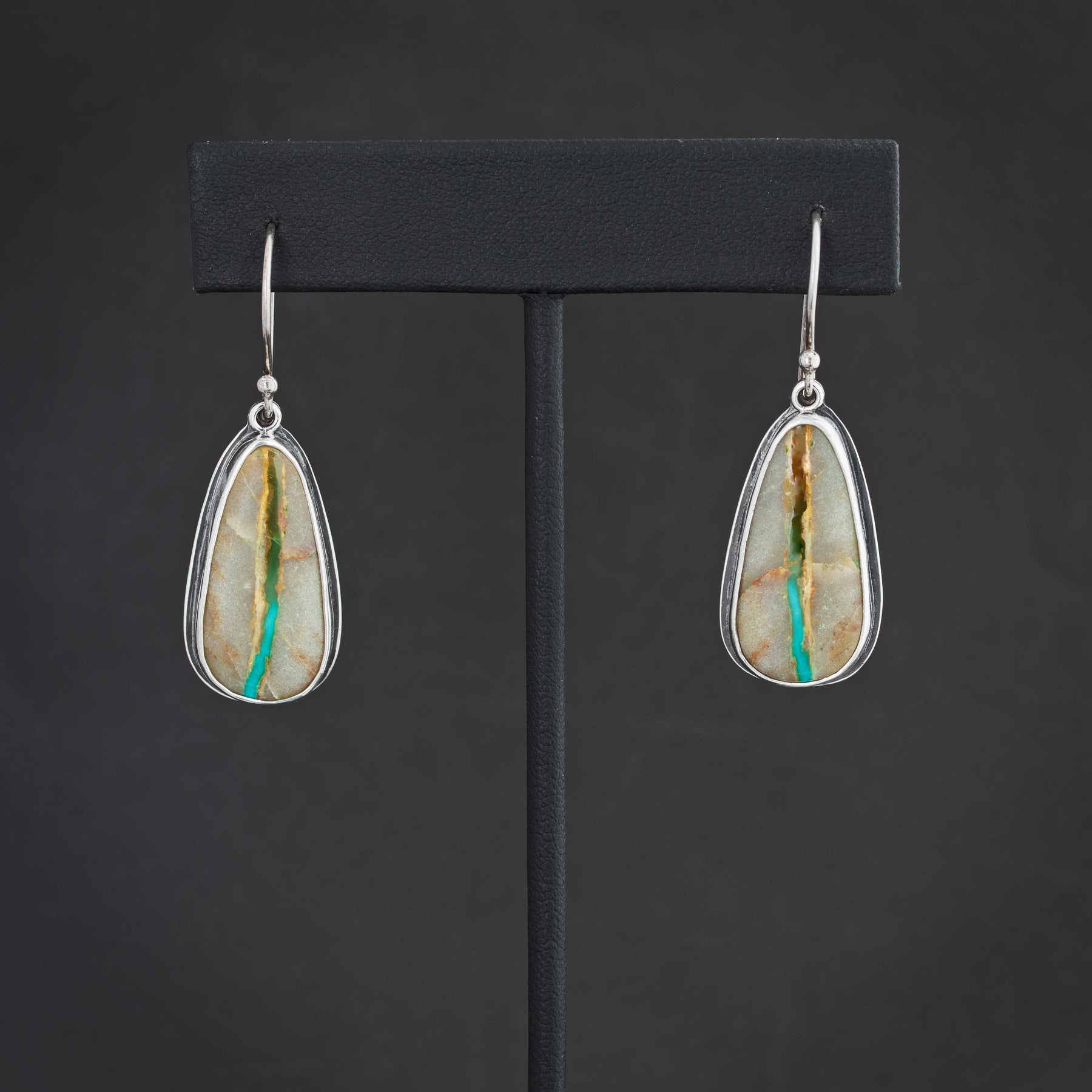 Royston Ribbon turquoise has a soft, ethereal palette — cool blues flowing through warm golden stone — making these earrings versatile enough for both casual days and elevated evenings. They’re earthy, elegant, and effortlessly wearable.