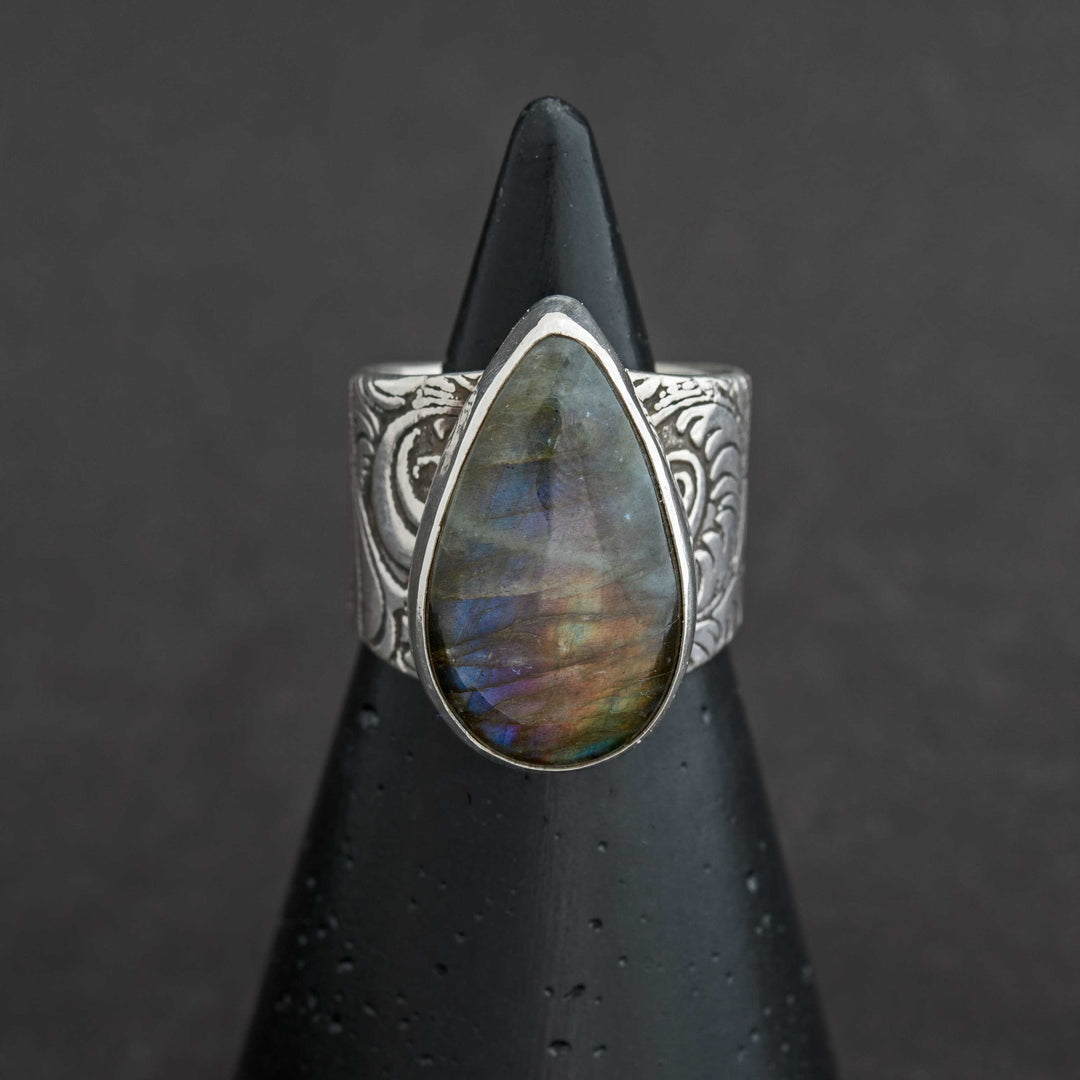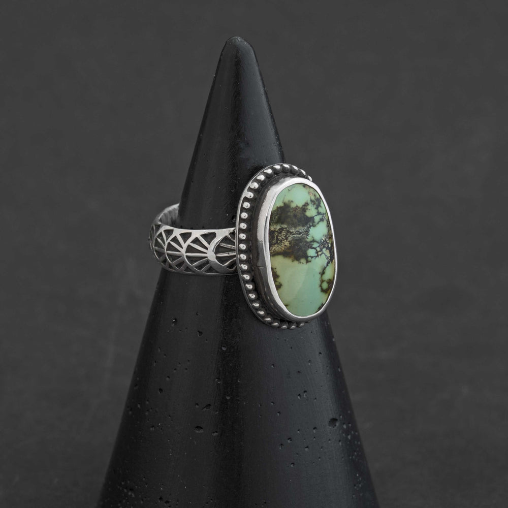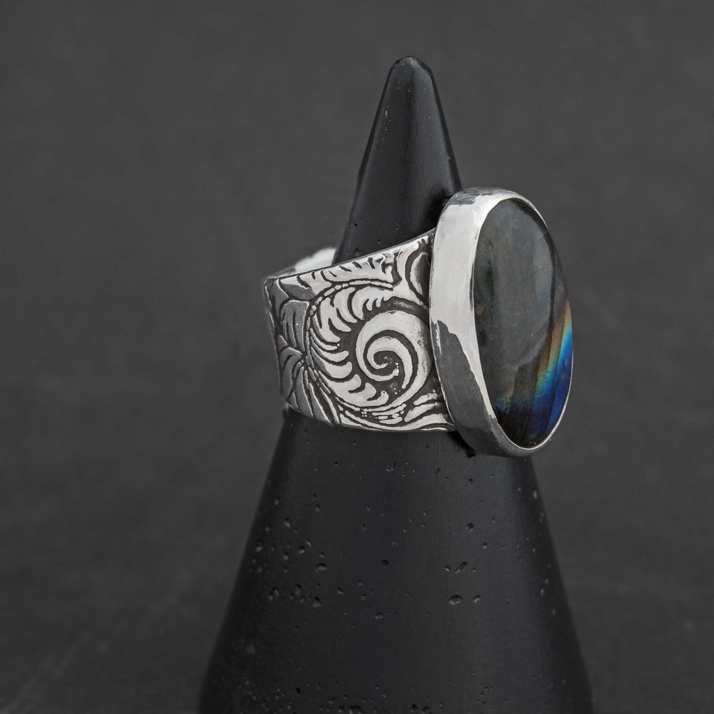 Our rings feature a treasure trove of exceptional gemstones, including rare turquoise varieties like Blackjack, luminous labradorite, mystical moonstone, rich garnets, and more. Each stone is thoughtfully paired with silverwork that enhances its natural beauty and character.
