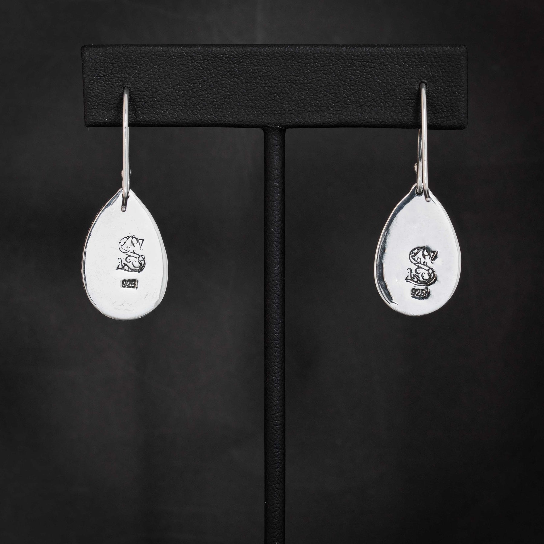 The teardrop shape is framed in a delicate sterling silver rope border, giving them a timeless yet earthy feel. They’re substantial enough to make a statement but still comfortable for all-day wear, finished with handmade Argentium silver ear wires for extra tarnish resistance.