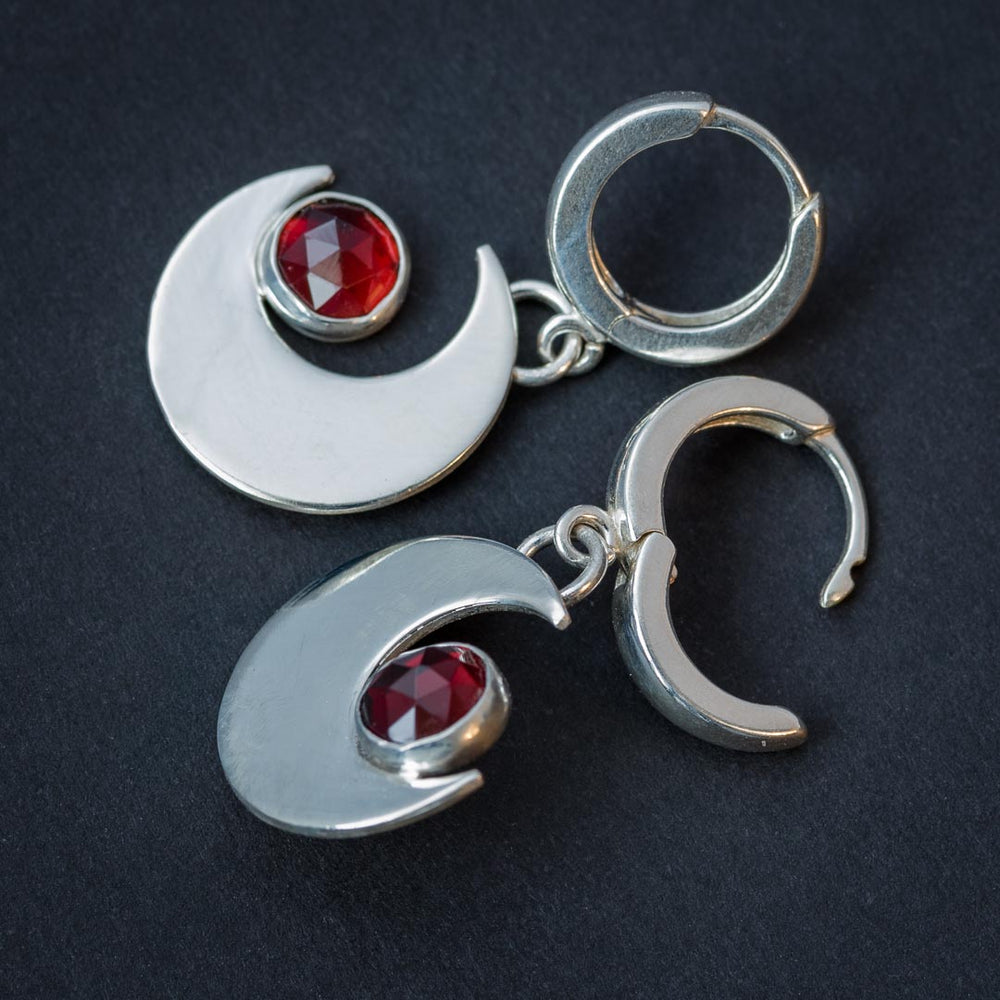 These dainty garnet crescent moon earrings are more sleek and minimalist for the modern vampire or witch who doesn't want to give their age away with ornate, old world jewelry. The sterling silver crescent moons are polished to a high shine and feature blood red Mozambique garnets nestled into the curve of the crescent moon. The silver crescent moons are suspended from sterling huggie hoop earrings.